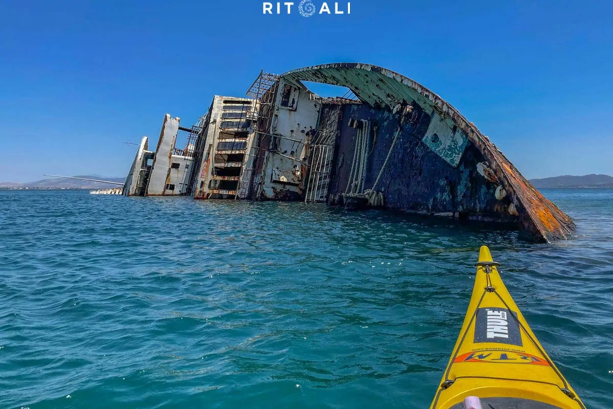 Veslajući, moja senka kajaka se podudara sa linijama broda, a iz mračnih otvora kao da se mogu čudi zvuci luksuza, slave i smeha stotina sudbina. Ne pokušavam da se privežem za brod niti da se prošetam po stranici broda jer mi deluje previše trulo i nesigurno za hodanje. Nemam baš dobar osećaj da se upustim u avanturu obilaska olupine. Ovo je moj 10 dan u kajaku nakon višednevnog obilaska ostrva Zakintos i mentalni i fizički umor me svakako sustiže, poigrava se sa mnom.